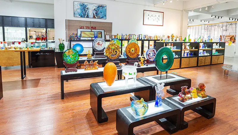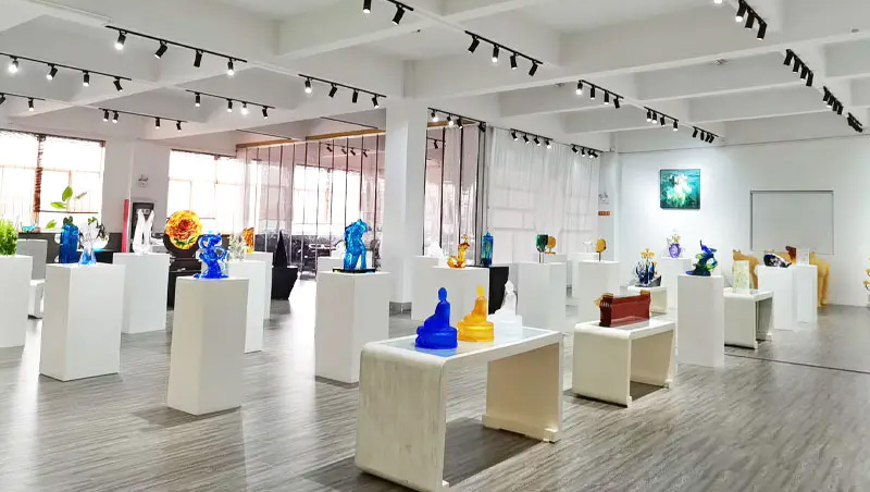 Karya seni kaca telah berkembang secara beransur-ansur daripada hadiah kraf tradisional untuk merangkumi perabot hiasan, budaya Buddha, pinggan mangkuk kristal dan barang kemas yang bergaya. Pangkalan pengeluaran syarikat terletak di bandar air yang indah dan makmur Jinxi di Kunshan, Wilayah Jiangsu. Ia mempunyai ruang penyelidikan dan pembangunan untuk pengeluaran kaca yang menjangkau 35,000 meter persegi. Kemudahan ini dilengkapi dengan keupayaan reka bentuk bebas, teknik pemodelan tanah liat, dan sumber penyelidikan dan pembangunan teknologi, menunjukkan kemahiran matang dalam kedua-dua proses pembangunan produk dan pembuatan.