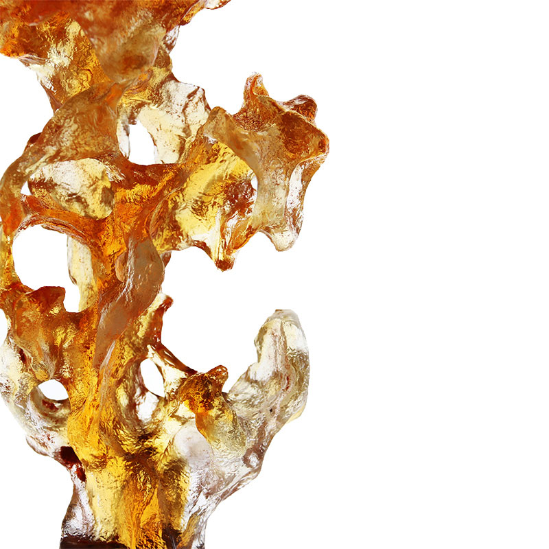 Sebenarnya, kerja seni kaca mengandungi buih adalah perkara biasa. Ini disebabkan oleh penggunaan teknik tuangan lilin hilang, yang secara semula jadi mengakibatkan kehadiran buih di dalam kepingan. Cara cahaya membias melalui buih dalaman ini mempamerkan daya tarikan unik bahan kaca. Ia menggambarkan dengan indah bahawa kaca benar-benar berfungsi sebagai wadah untuk cahaya.
