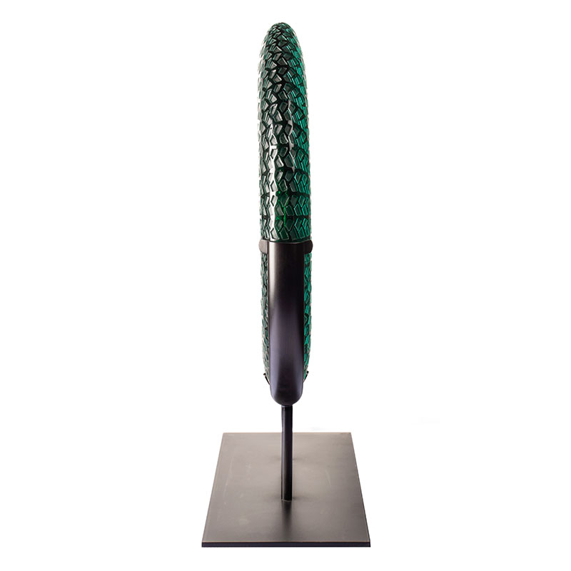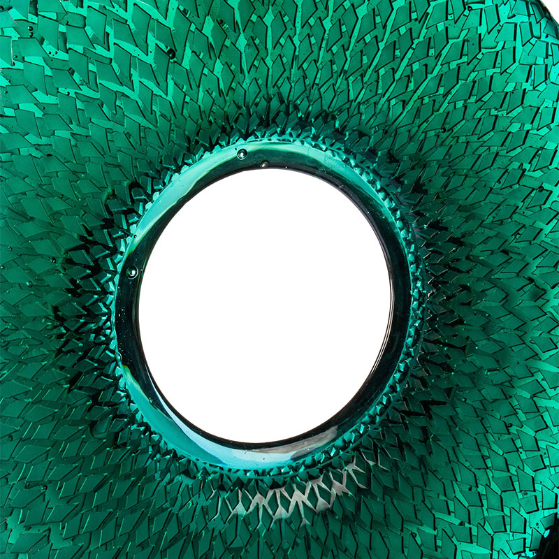 Karya ini mengambil daun buluh sebagai inspirasi semula jadi, menangkap semangat halus buluh hijau yang bergoyang ditiup angin hutan. Melalui lutsinar kaca, ia memunculkan seribu pantulan buluh yang berkilauan. Warna biru menghijau itu merangkumi kedua-dua kesegaran rumpun buluh sebelum embun pagi menyejat dan keanggunan lembut masa berlalu. Corak yang rumit, seperti urat daun buluh yang terbentang, riak dengan lapisan cahaya ketika ia menari di seluruh permukaan, menangkap semangat gunung liar dalam bingkai bulat.