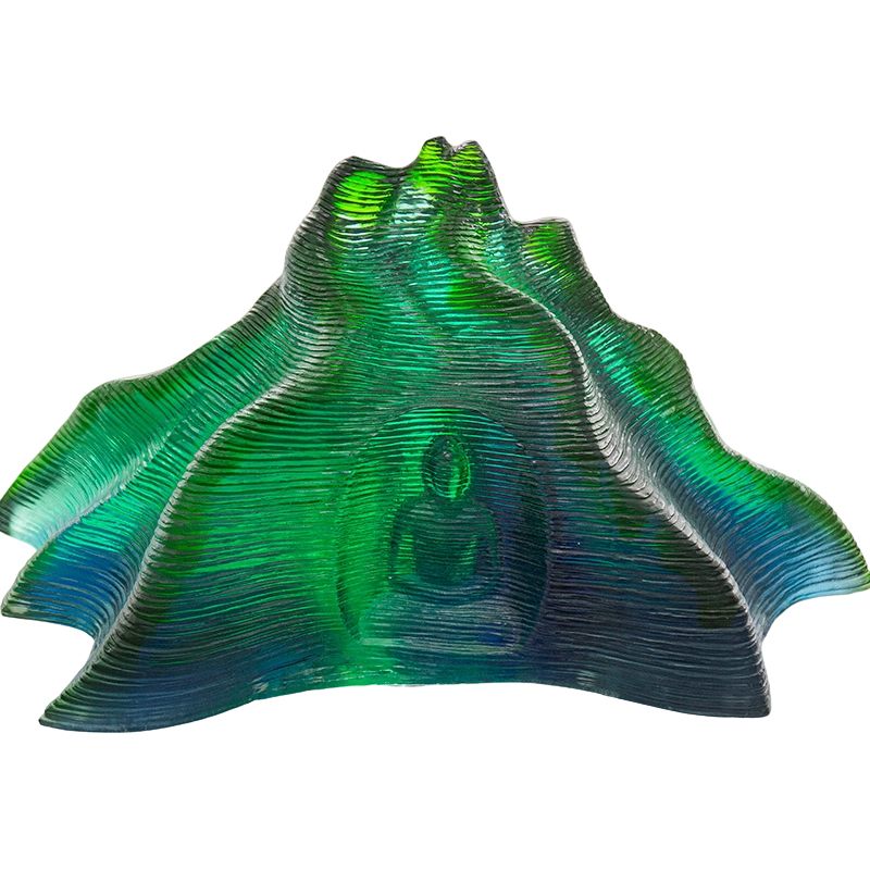 Ketelusan, kecerunan warna dan interaksi cahaya dan bayang dalam kaca kristal berfungsi sebagai 'Medium Zen' yang menghubungkan masa lalu dan masa kini. Kecerunan daripada hijau menghijau kepada biru pekat mendapat inspirasi daripada hutan yang subur dan senja yang tenang di Gunung Anyue, bergema dengan imejan ‘lukisan landskap biru-hijau’ tradisional Cina—menggunakan rona alam semula jadi untuk menghubungkan kuil gua dengan irama syurga dan bumi. Apabila cahaya meresap ke dalam kaca berlapis, gabungan warna dan ilusi bercantum, membangkitkan sinaran kabus fajar yang berjerebu menyelubungi gua. Kewujudan bersama dialektik 'kekosongan' kaca (kualiti lut sinar) dan "warna" (nada hijau-biru yang sejuk) menafsirkan pandangan falsafah utama Buddhisme: 'kekosongan adalah bentuk, bentuk adalah kekosongan.' Apabila cahaya dan bayang-bayang mengalir merentasi permukaan melengkung, gunung membentuk dan siluet Buddha— terus menerus berubah dengan 'pemupukan segera, endokan. membangkitkan ketenangan mendalam yang disuling oleh ribuan tahun angin dan hujan pada ukiran batu Anyue.